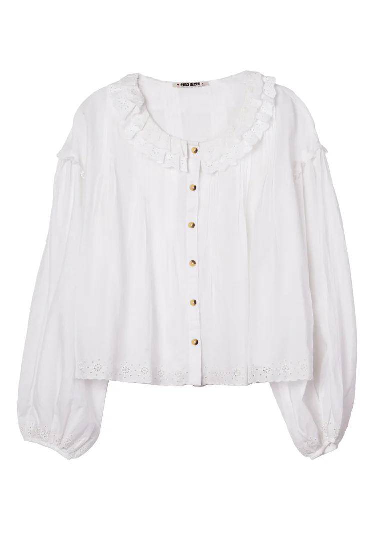 The Anaia Top in White Embroidered Cotton is a women’s long sleeve embroidered cotton blouse with a ruffled collar neckline, lace accents, and sun motif embroidery.