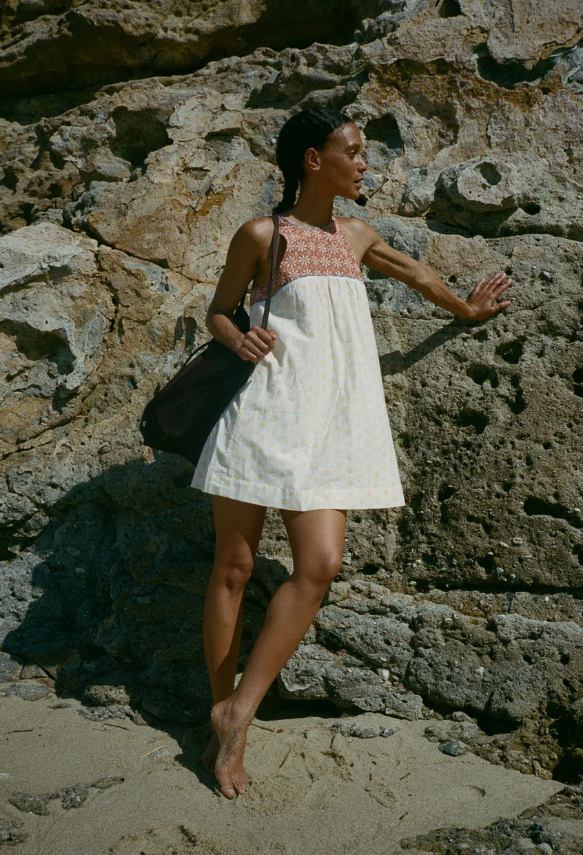 The Eros Dress is a mini length tank style shift dress crafted from cotton voile. This classic silhouette is fun and bright in our Palma print. Pair the Eros dress with our