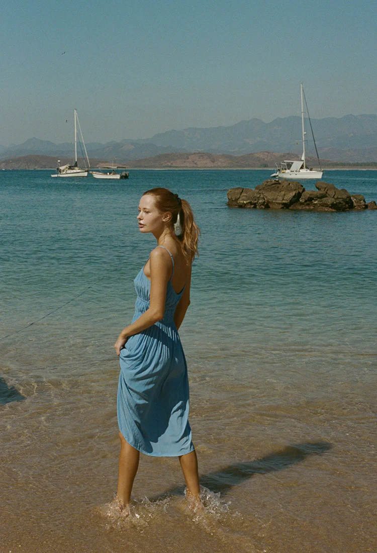 The Gabriela Dress in Amalfi Blue is a women’s sleeveless midi dress in an ocean inspired hue. Designed with a keyhole closure at the bust and two panels of elastic beneath it, the silhouette feels soft while still defining the shape. The fluid skirt moves beautifully from daytime plans to evening outings, making it a versatile warm weather staple. Pair with the K. Jacques x Ciao Lucia Wrap Sandal or the K. Jacques x Ciao Lucia Red Flip Flop for a complete head to toe Ciao Lucia look.Â
