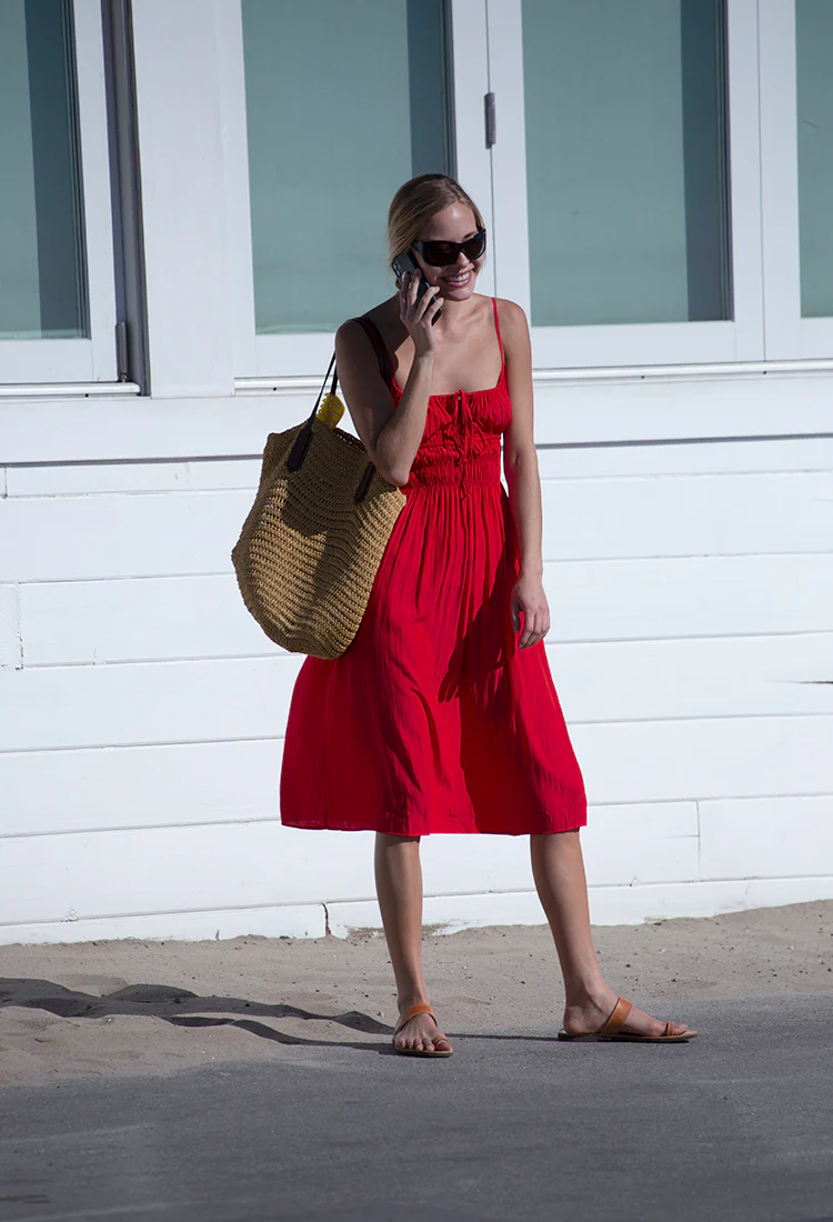 The Gabriela Dress in Chili is a women’s sleeveless midi dress in a vibrant chili red. Designed with slim spaghetti straps, a keyhole detail at the bust, and two tiers of smocking at the waist, it creates a flattering, feminine shape. Adjustable straps allow for a personalized fit, making it an easy choice for warm evenings, special occasions, and nights out. Pair with the K. Jacques x Ciao Lucia Wrap Sandal or the K. Jacques x Ciao Lucia Red Flip Flop for a complete head to toe Ciao Lucia look.Â