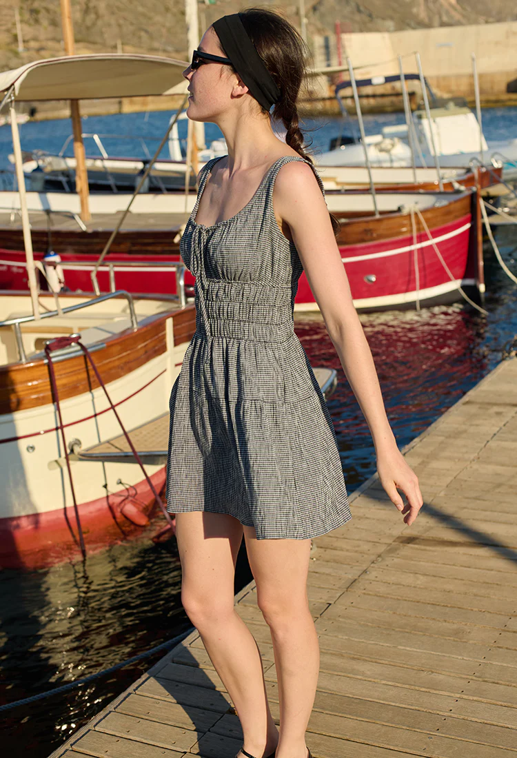 The Gianluca Dress in black gingham is a sleeveless cotton mini dress with a ruched bust, an adjustable tie keyhole, three tiers of smocking at the waist, and a flouncy tiered skirt. Pair with the K. Jacques x Ciao Lucia Wrap Sandal for a complete head to toe look.