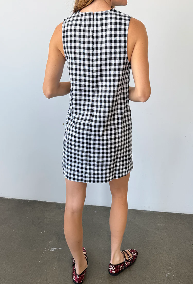 The Indus Dress in Gingham is an airy linen mini dress with pockets. This classic shift dress is an easy throw on style and the black and white gingham print will have you reaching for her over and over as she pairs well with all your favorite accessories like the Viani Embroidered Satin Slides or Viani Ruby Double Mary Janes.
