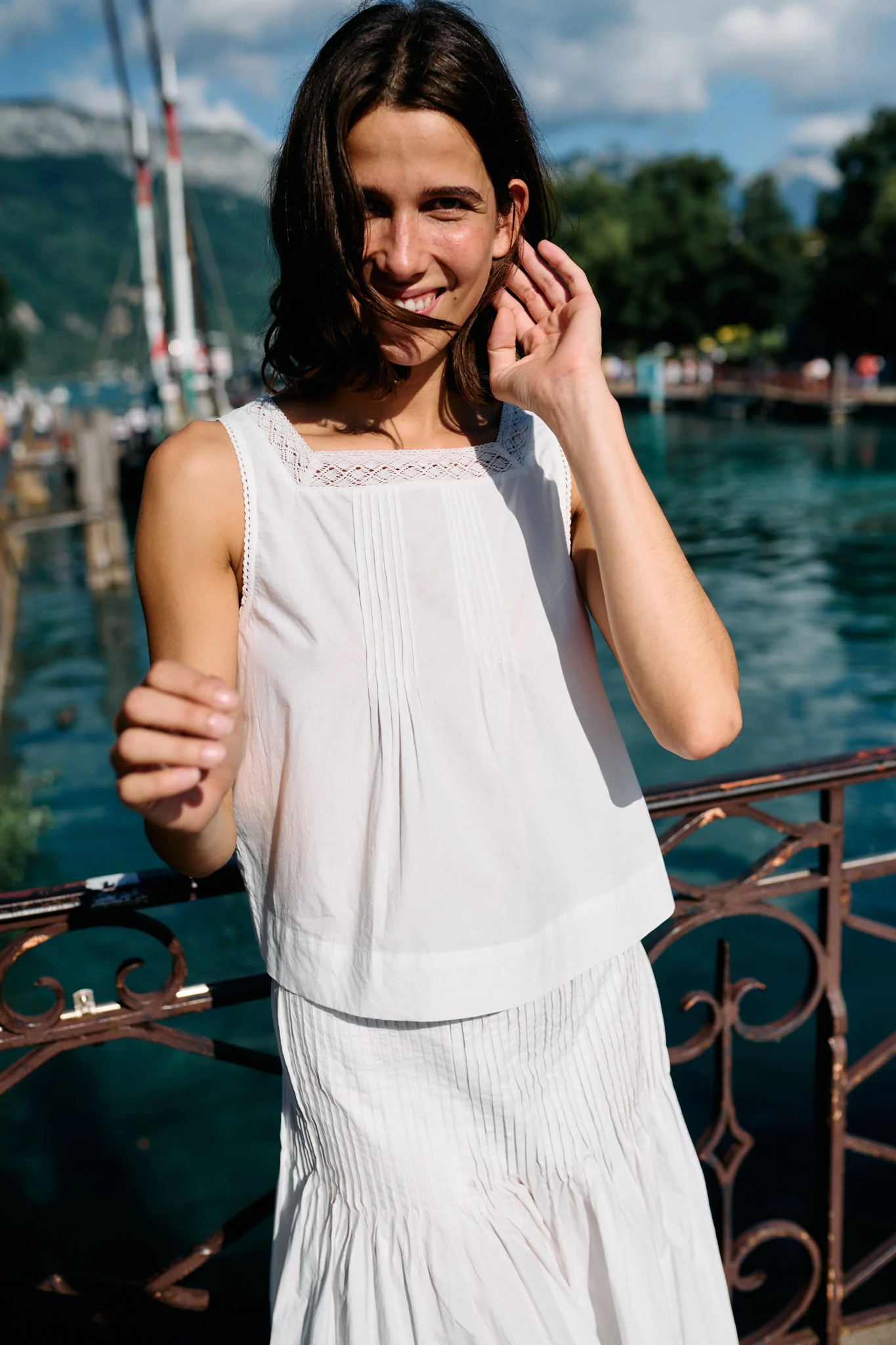 The Lexi Top in white cotton poplin is a boxy fit tank top featuring lace neckline and arm hole trim. The vertical pintuck is a flattering detail for all body types and this classic yet refined tank is sure to be a staple in your closet as you can pair it back to our Rosa Skirt or style it with your favorite jeans and flats like our K. Jacques x Ciao Lucia Wrap Sandal.Â