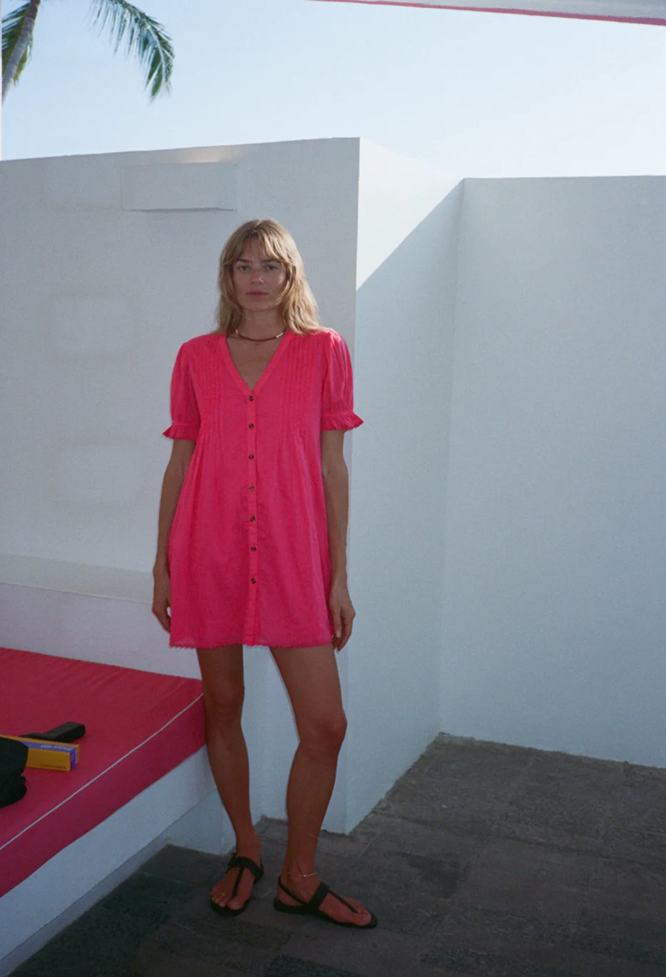 The Nayara Dress in Guava is a women’s short-sleeve cotton mini dress featuring a V neckline and buttons down the center front. Designed with pleating at the chest and a scalloped hem.