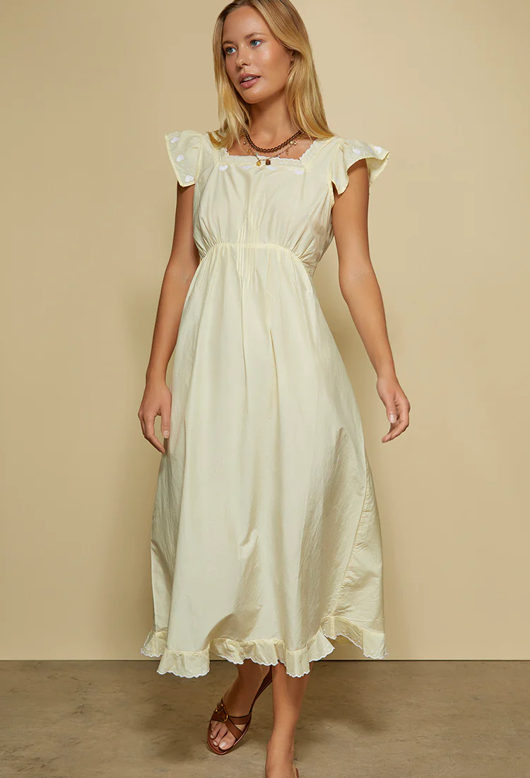 The Olin Dress in butter is a fluttery short sleeved cotton-silk blend midi dress featuring white heart embroidery detail and a ruffled scalloped hemline.Pair with the K. Jacques x Ciao Lucia Wrap Sandal or the K. Jacques x Ciao Lucia Red Flip Flop for a complete head to toe Ciao Lucia look.