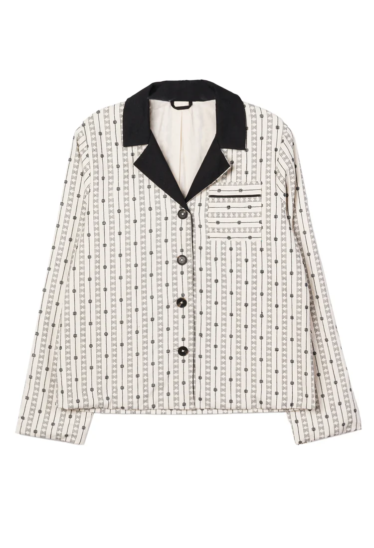 The Talia Jacket is a suit style jacket in a cotton twill fabric. Featuring tonal embroidery detailing, black collar and dark horn buttons, the Talia is a perfect piece for transitional styling. Wear her as a shacket with our Dito Short or layer her over one of our slip dresses paired with the